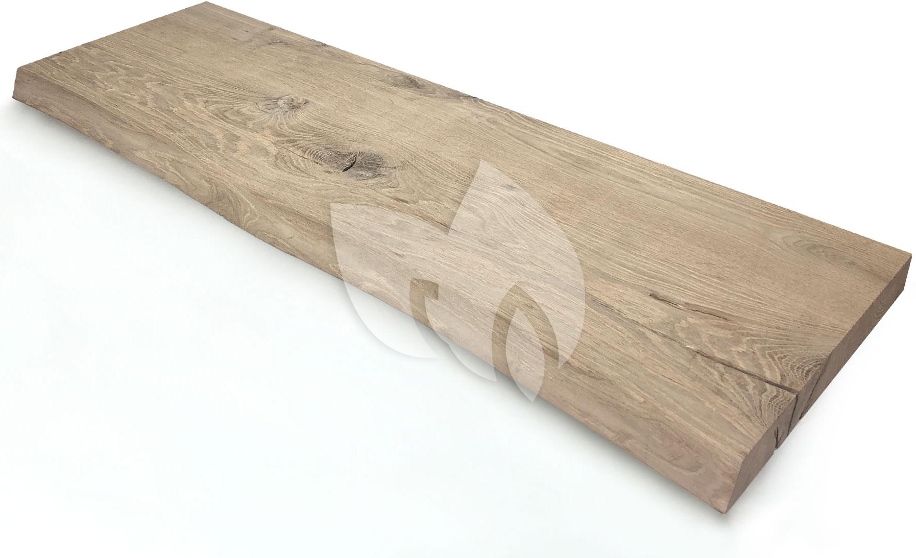 Deze plank van oud hout kent een boomstamvorm afwerking. Aan de voorzijde van de plank zie je nog goed waar de schors heeft gezeten en de golvende vorm hiervan is nog zichtbaar. Dit detail geeft een levendige, landelijke uitstraling. Oud eikenhout vertoont meer groeven dan massief eiken, het is een geleefde plank. Dit hout krijgt een nieuw leven door het te gebruiken voor de zwevende wandplank van oud eiken. Eikenhout is een van de bekendste houtsoorten en is erg geliefd in ieders interieur. Oud eiken heeft een karakteristieke uitstraling met hier en daar wat meer scheurvorming of de afdruk van knoesten.