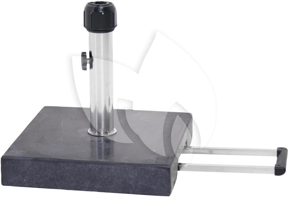 Deze zwart granieten parasolvoet met RVS details misstaat absoluut niet op uw terras. Verplaatst u uw parasol regelmatig tussen verschillende zithoekjes in de tuin? Dan is deze parasolvoet absoluut geschikt voor u. Met behulp van de interne wieltjes en de uitschuifbare arm creëert u een trolley systeem waardoor het gewicht beter te verplaatsen is.