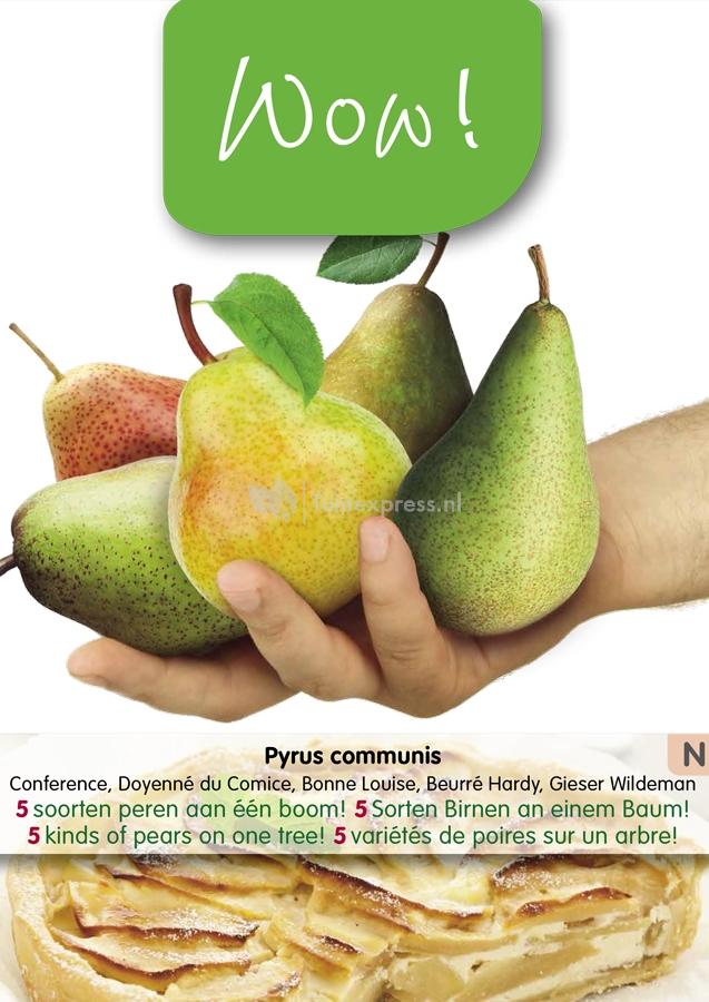 Deze familie perenboom heeft gegarandeerd voor ieder wat wils. Maar liefst 5 soorten peren zijn hier geënt op één stam. Zo kunt u met deze perenboom in uw tuin genieten van de soorten Conference, Doyenne du Comice, Bonne Louise, Beurre Hardy en Gieser Wildeman. Dat staat garant voor heel wat handperen, taarten en salades!