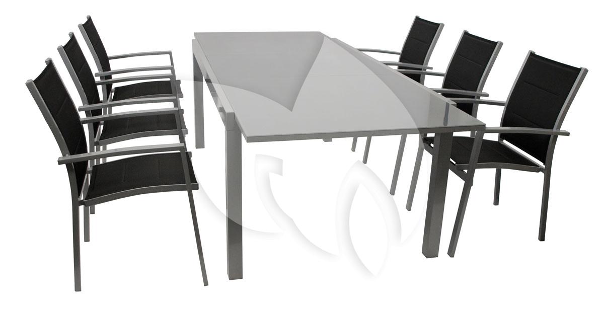 7-delige set: Een praktische set bestaande uit 6 stapelstoelen met armleuningen en een uitschuiftafel van 180/240x100cm. Het frame is gemaakt van aluminium in de kleur grijs en de bekleding van kunststof stof in de kleur zwart. Het tafelblad is van glas in de kleur grijs.