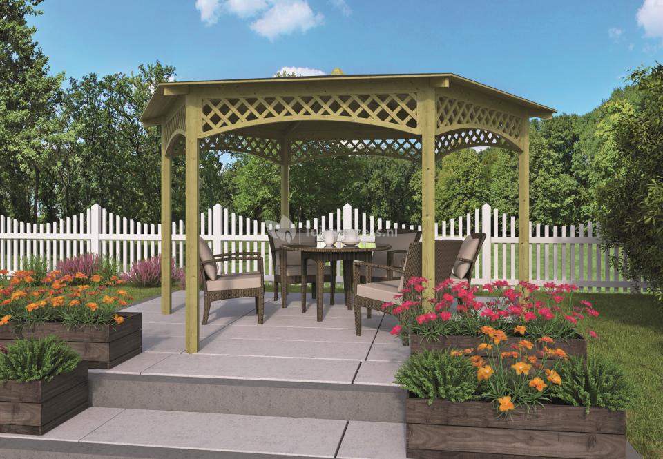 Klassiek houten prieel met dakshingles. Prieel wordt als bouwpakket geleverd inclusief alle bevestigingsmaterialen en handleiding.
