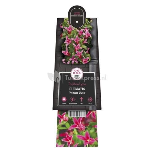 Deze roze bosrank is gekweekt als eerbetoon aan Prinses Diana. En dat is een prachtige bloem geworden! Een kleine, tulpvormige bloem in een heldere roze kleur. Na de bloei blijft een sierlijk pluizig bolletje zichtbaar. De voet van de bosrank dient altijd beschermt te worden tegen direct zonlicht bijvoorbeeld door hier een andere plant voor te plaatsen. De bosrank houdt van een voedingsrijke bodem en zal dit belonen met een uitbundige bloei. Kies deze sierlijke bosrank om uw muur mee op te fleuren.