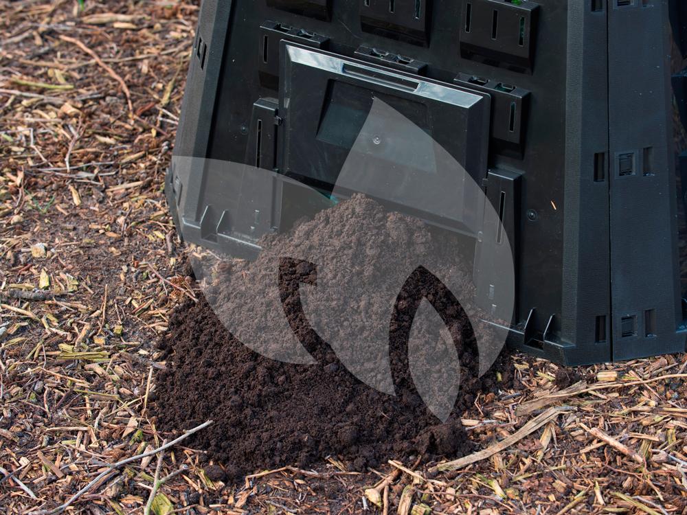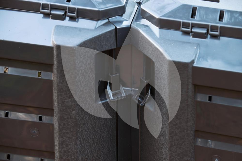 De compostbakken zijn vervaardigd uit bestendig polypropyleen in de kleur zwart en heeft gezamelijk een ruime inhoud van 1200 liter. De compostbakken zijn aan elkaar geschakeld en allemaal voorzien van een scharnierend deksel om het afval in te werpen en een opening aan de voorzijde om de compost te kunnen omwoelen of verwijderen. In de wanden van de silo's zijn Thermolen verwerkt die voor een constante hoge temperatuur zorgen waardoor het afval sneller wordt afgebroken. De compostbakken beschikken over een inklapbaar systeem waardoor ze makkelijk in elkaar te zetten is en waarnodig eenvoudig opgebergd kunnen worden. Om micro-organismen aan te trekken kunt u de compostvaten het beste op de grond in de schaduw neerzetten. Leg op de bodem enkele takken neer, dit zal zorgen voor een goede afwatering en verluchting.