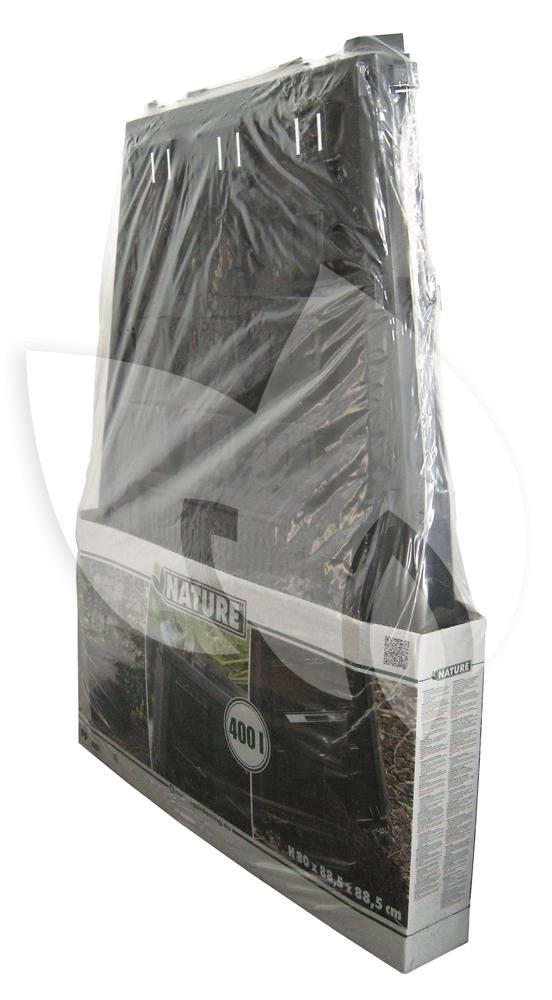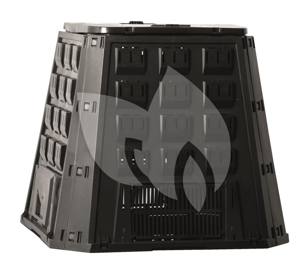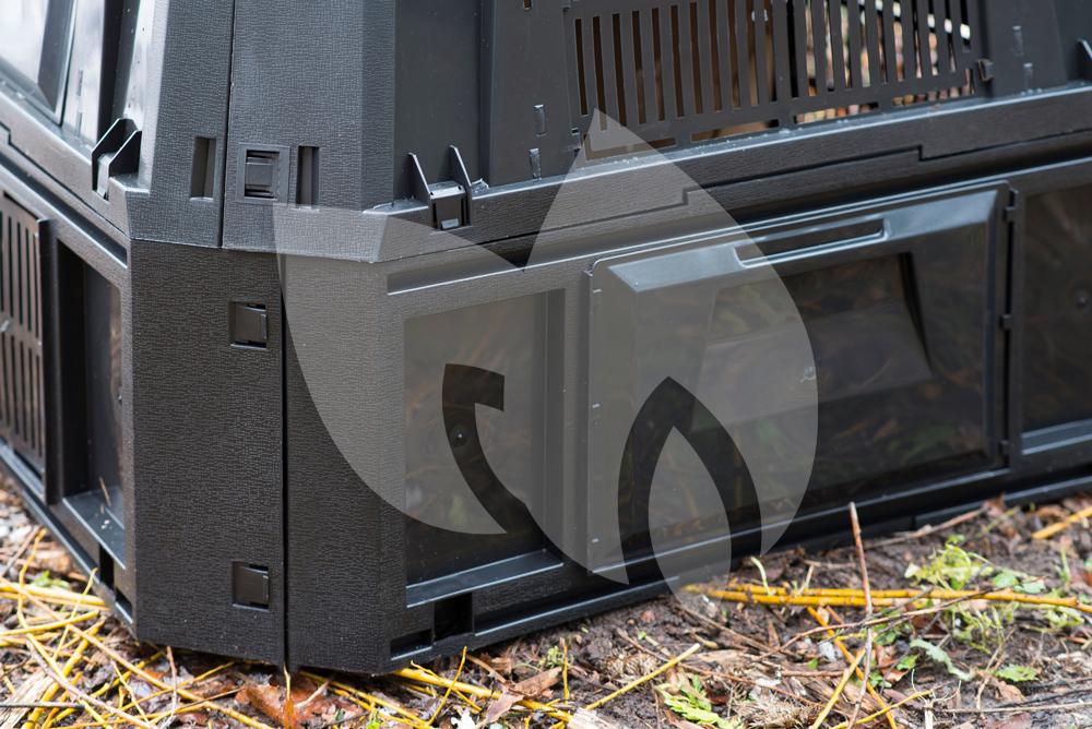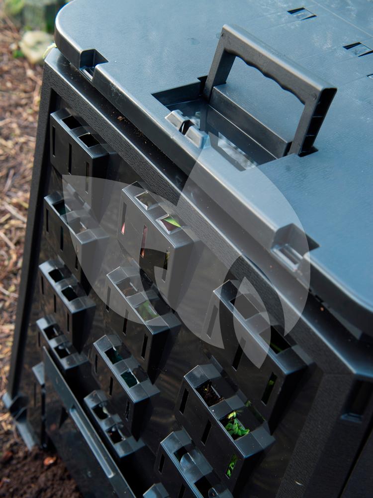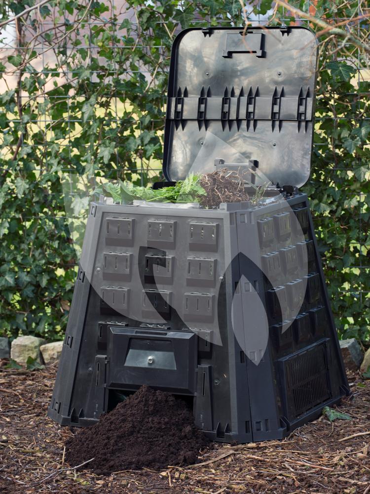 De compostbak is vervaardigd uit bestendig polypropyleen in een zwarte kleur. De compostbak is voorzien van een scharnierend deksel om het afval in te werpen en een opening aan de voorzijde om de compost te kunnen omwoelen of verwijderen. In de wanden van de silo zijn Thermolen verwerkt die voor een constante hoge temperatuur zorgen, waardoor het afval sneller wordt afgebroken. De compostbak beschikt over een inklapbaar systeem waardoor hij makkelijk in elkaar te zetten is en waarnodig eenvoudig opgebergd kan worden. Om micro-organismen aan te trekken kunt u het compostvat het beste op de grond in de schaduw neerzetten. Leg op de bodem enkele takken neer, dit zal zorgen voor een goede afwatering en verluchting.