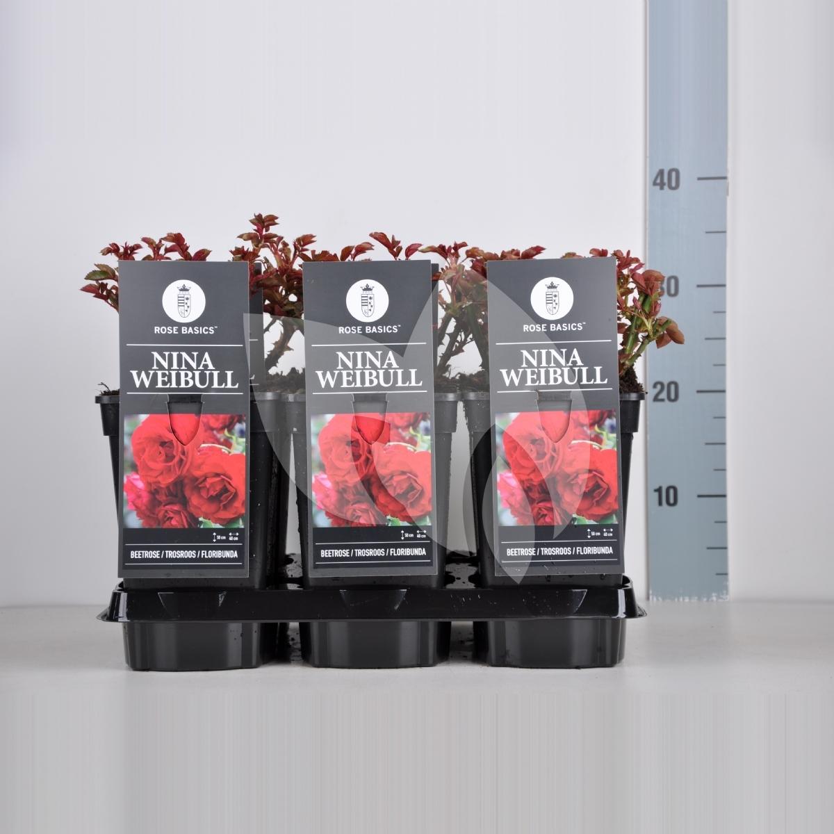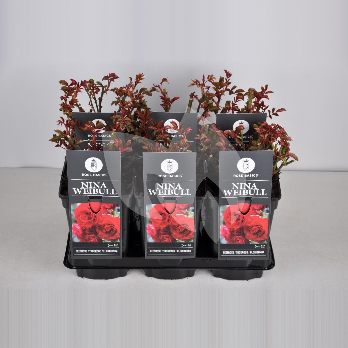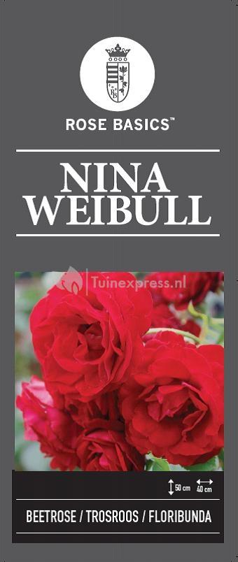 De rijkbloeiende Nina Weibull roos is een zeer sterk exemplaar. Ondanks de vele bloemen die aan de takken verschijnen zal de struik ze kunnen blijven dragen aan zijn sterke stelen. Deze trosroos bloeit met helderrode, prachtig gevulde bloemen. Deze struikroos wordt ongeveer 80cm hoog en is een mooi exemplaar als solitair of te combineren met andere beplanting.