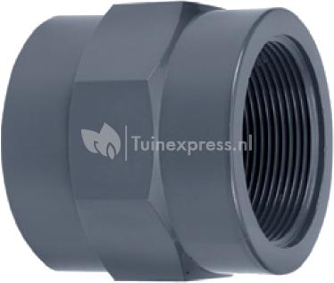 Hoogwaardige PVC schroefbus met binnendraad. Deze schroefbus kan bijvoorbeeld aan een PVC-buis verlijmt worden om zo een schroefaansluiting te creëren.