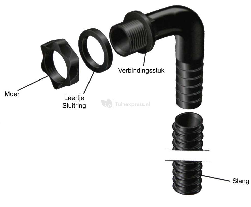 De overloop wordt in een complete set aan u geleverd zodat u hem snel en gemakkelijk bij uw regenton kunt monteren. De set is voorzien van een slang, leertje/sluitring, moer en een haakse verbindingsstuk. Dankzij deze haakse aansluiting zal de slag niet gaan knikken en bent u ervan verzekerd dat hij altijd zijn werk zal doen!