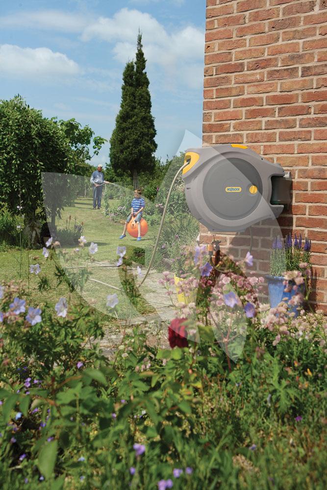 Met zijn tuinslang van 30 meter is deze tuinslanghaspel geschikt voor een middelgrote tot grote tuin. Het automatisch oprolsysteem zorgt dat u zonder enige moeite uw tuinslang weer veilig opbergt. De slanghaspel hangt u op werkhoogte en is 180 graden draaibaar zodat u eenvoudig alle plekjes in de tuin kunt bereiken. Ook bij het opbergen van de slang maakt u gebruik van deze wendbaarheid; door de haspel te draaien plaatst u de haspel tegen de muur, op deze manier kunt u ruimte besparen in uw tuin.