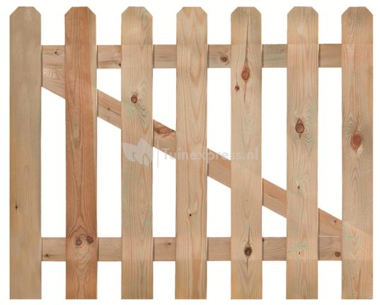 Tuinhekdeur gemaakt van geschaafd en geimpregneerd grenen. Voorzien van ronde hoeken.