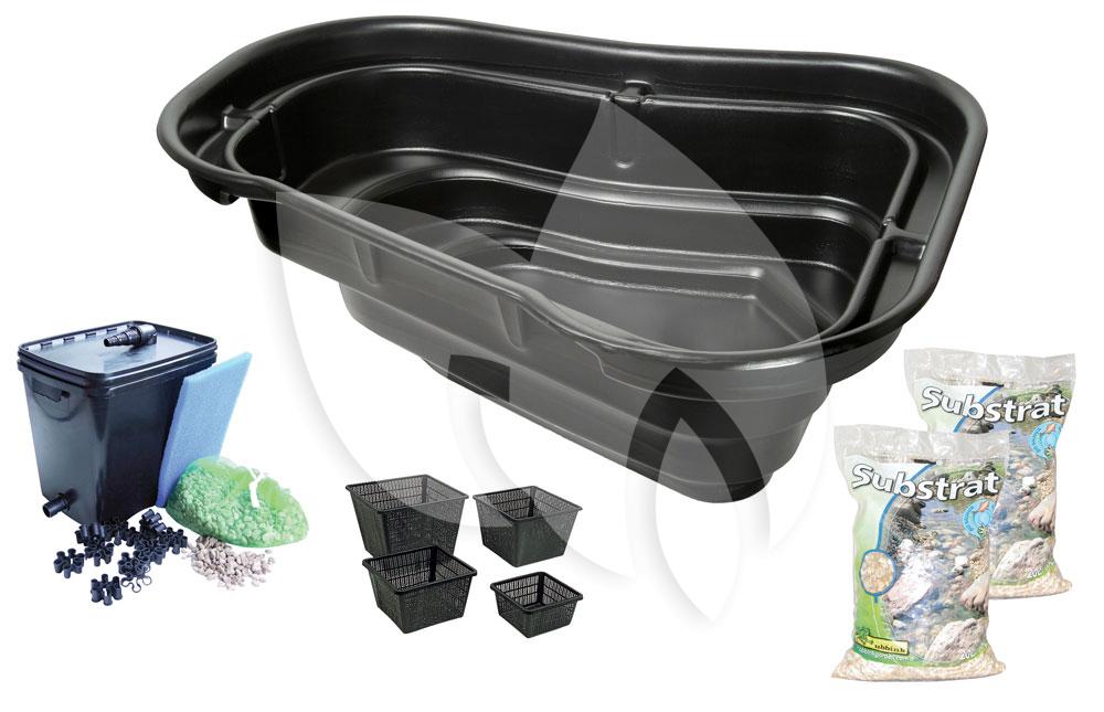 Met de Ubbink vijverset compleet Rhodos heeft u een complete set om een vijver in uw tuin aan te leggen. Met een vijver in de tuin creëert u een bron van rust en een levendige sfeer in de tuin, het enige dat u nog hoeft te doen is de voorgevormde vijverbak in te graven. Ook is het mogelijk om de vijverbak boven de grond te plaatsen en aan de zijkanten op te vullen met aarde, met daarop planten, grind of keien. De set wordt geleverd inclusief twee zakken substraat, waterplantmanden, een pomp, filter en natuurlijk de voorgevormde vijverbak. De vijverpomp heeft een capaciteit van 900 liter per uur en de filter heeft een capaciteit van 4000 liter. De inhoud van de voorgevormde vijverbak is 1000 liter.