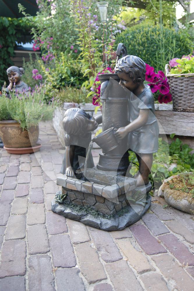 Dit schattige en bijzondere schouwspel van twee spelende kinderen bij het water voegt direct iets vrolijks toe aan uw tuin! Het decoratief, rustieke waterspel van de ''kinderen bij pomp'' is voorzien van schitterende details en een mooie bronzen look. Geniet met de Atlanta van een prachtig speels aanzicht in uw tuin en tegelijkertijd ook van het rustgevende, stromende water dat het ornament geeft!