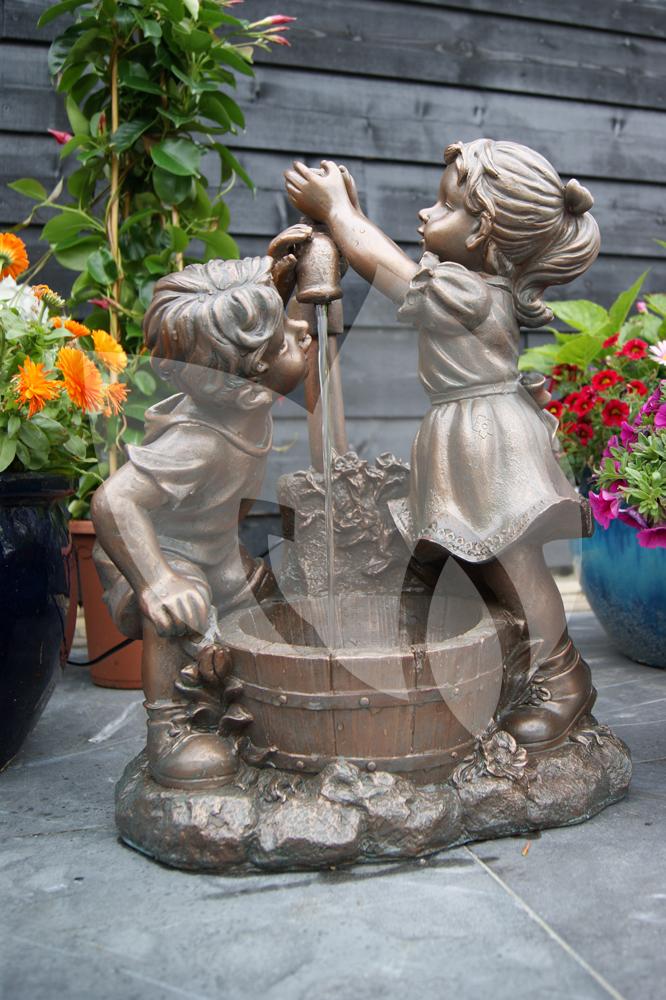 Wilt u graag uw tuin of terras aankleden op een sfeervolle en warme manier? Het waterornament Memphis is een decoratief en rustiek waterspel van spelende kinderen bij het water. Het meisje zorgt er als het ware voor dat er water uit de zwengelpomp komt, terwijl het jongetje er probeert van te drinken. Het beeld geeft een authentieke en speelse uitstraling aan uw tuin waarbij u tevens kunt genieten van het rustgevende geluid van zacht stromend water!