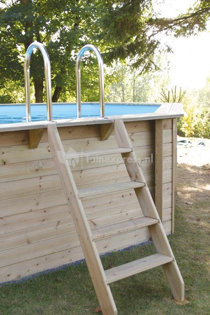 Inclusief: Vurenrand (aliminium afwerking), Skimmer, Houten trap buitenzijde (4 treden, verwijderbaar ter beveiliging van kinderen), Binnentrap (roestvrijstaal met 3 treden), Filterset, Isolatiezeil met rand, Vaste uitgang en 25m buis (50mm).