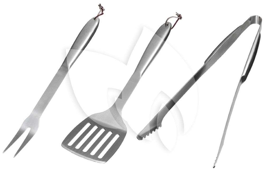 Deze luxe roestvrij stalen BBQ-gereedschapsset bestaat uit een vleestang, vork en een spatel