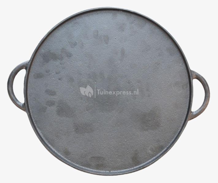 Ronde bakplaat geschikt voor barbecue of het maken van pizza’s. Deze hoogwaardige gietijzeren bakplaat heeft een rand langs het grilloppervlak met 2 handgrepen en staat stevig op 3 poten welke demonteerbaar zijn. Plaats de gietijzeren bakplaat op een vuurschaal of boven open vuur. Kan tevens ook als haard worden gebruikt. Geniet van een sfeervol haardvuur of gebruik de plaat praktisch als bakplaat.