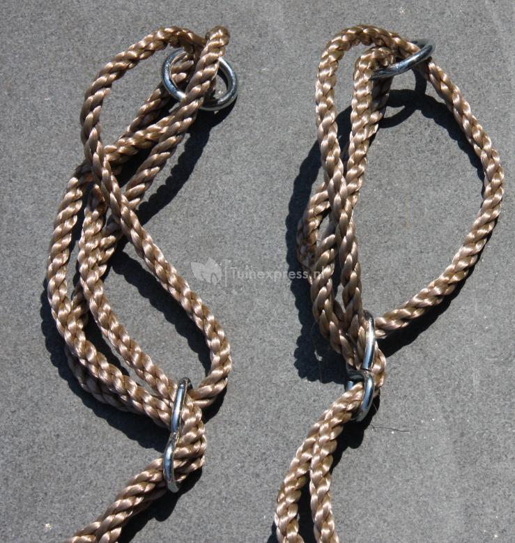 Houten trapeze met metalen ringen.