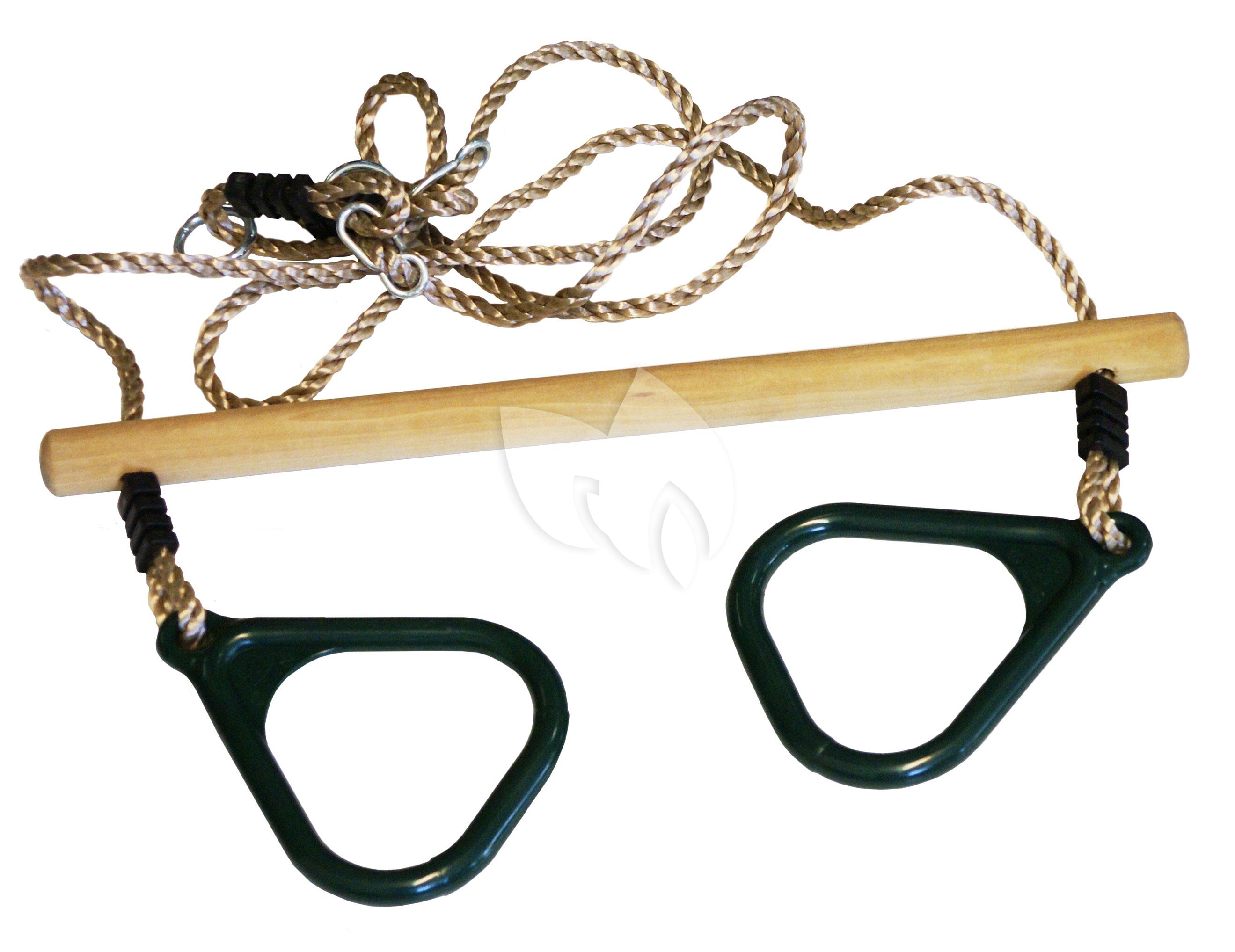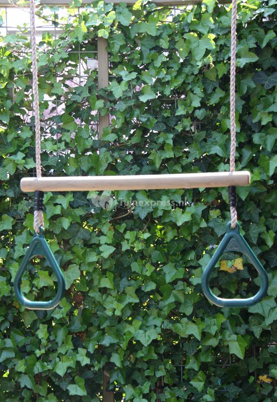 Houten trapeze met kunststof ringen.