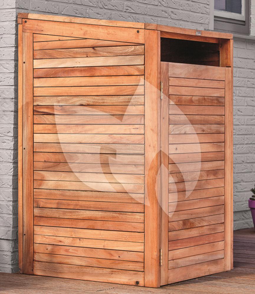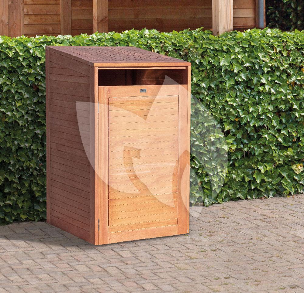 De hardhouten kliko ombouw enkel is een containerberging geschikt voor 1 vuilcontainer. Het mooie hardhout zorgt ervoor dat jouw kliko geen aandacht meer trekt, hij zal onopvallend weg staan. De ombouw gaat aan de bovenzijde open middels een gasveer, zodat je het afval gemakkelijk in de container kunt doen. Via de deur aan de voorzijde rij je de kliko er zo in of uit.