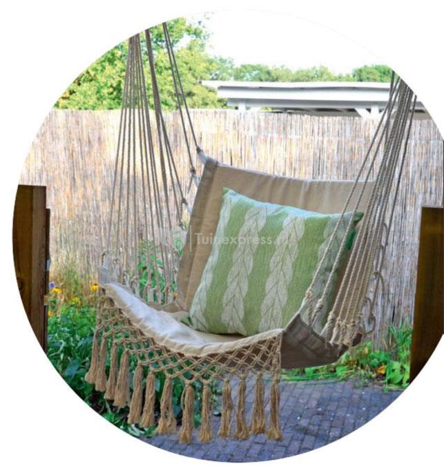 Deze stijlvolle hangmatstoel Macrame beige is een relaxte en mooie hangstoel voor in de tuin, op het terras of voor in de woonkamer. De hangmatstoel biedt de ultieme manier om een relaxte en ontspannen plekje op uw terras of in huis te creëren. Het mooie design zorgt er tevens voor dat de hangstoel een blikvanger is in iedere omgeving.