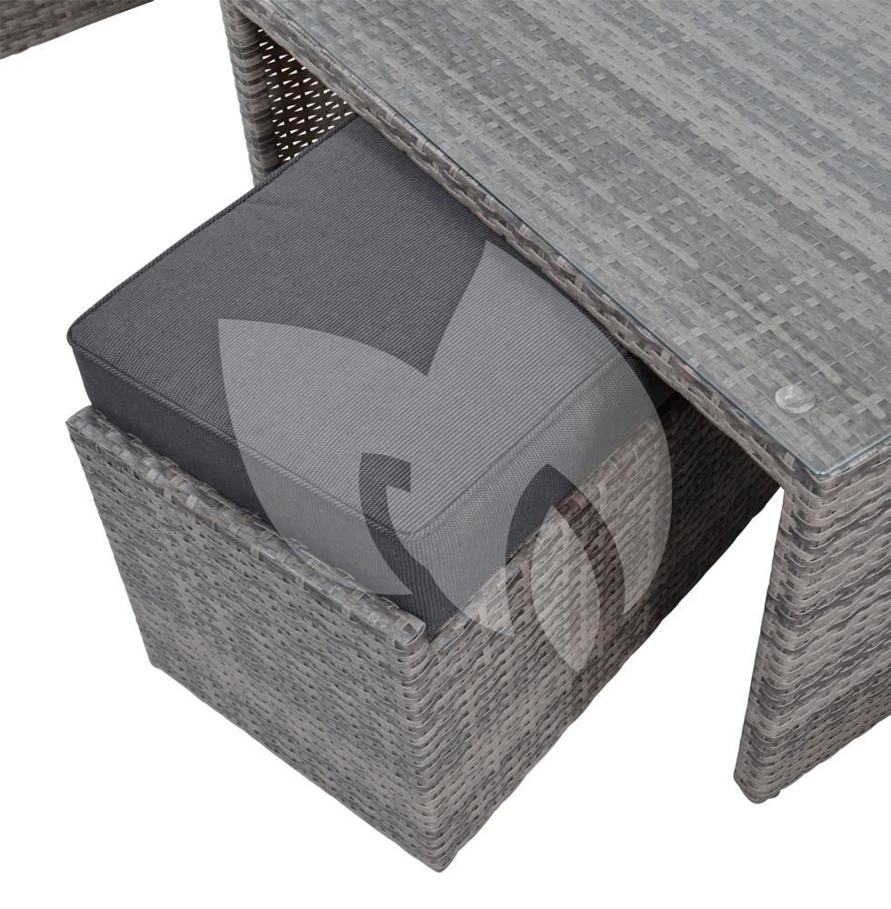 Dit loungeset is niet enkel mooi om te zien, ook is het set zeer praktisch en op verschillende manieren te gebruiken. Het set is uitgerust met 2 bankjes die ruimtebesparend opgeborgen kunnen onder de tafel. De bankjes zijn ideaal om 4 extra zitplaats te creëren bij visite, maar u kunt ze uiteraard ook aan de bank schuiven zodat u heerlijk kunt relaxen met de voeten omhoog. De tafel is stijlvol afgewerkt met een glasplaat. En het loungeset wordt uiteraard afgeleverd met bijbehorende comfortabele zwarte waterafstotende kussens. Zitcomfort gegarandeerd met dit Lugo loungeset in uw tuin!