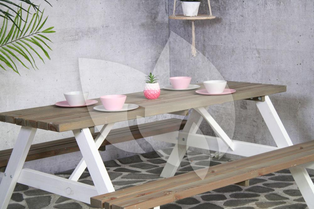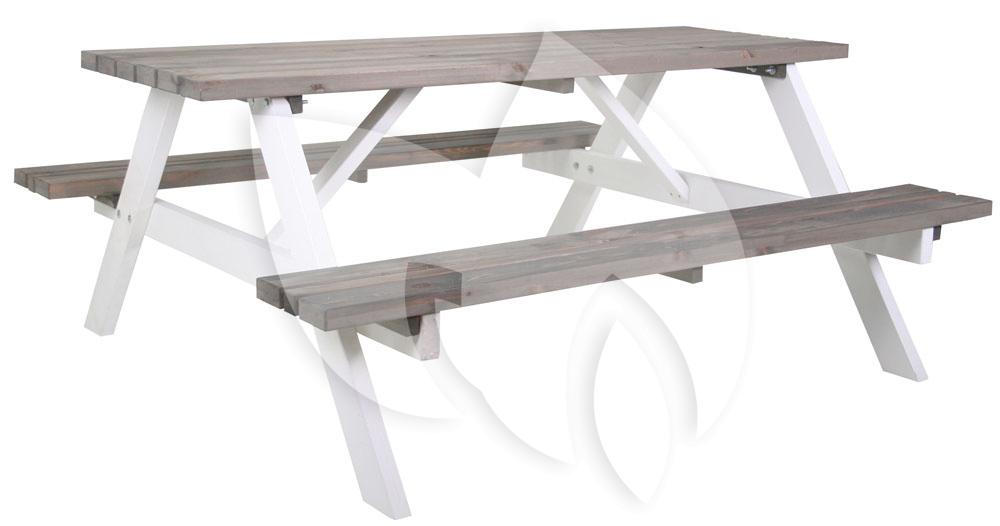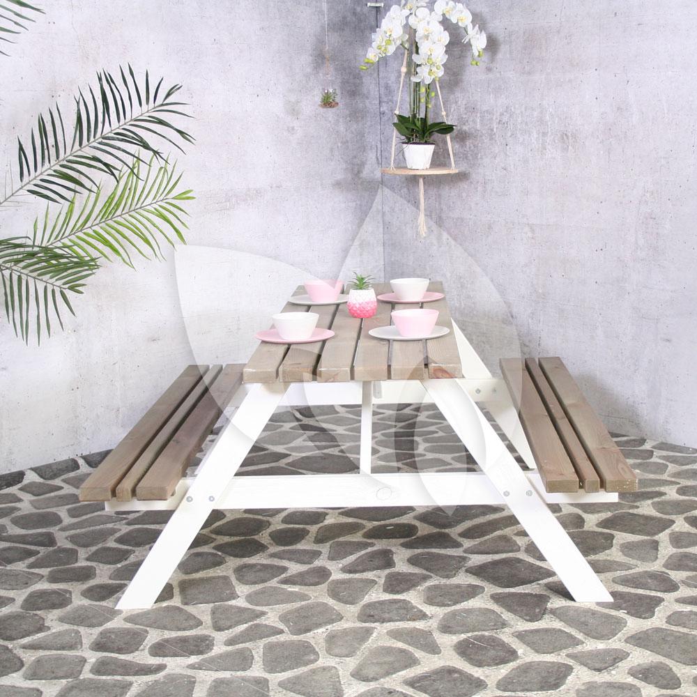 Geniet van het mooie weer met deze picknicktafel Simone. Met de picknicktafel creëert u op een eenvoudige manier een leuke zithoek in uw tuin. De tuintafel is gebeitst in wit en grijs, het contrast tussen deze twee kleuren geeft de tafel een luxe uitstraling. De picknicktafel is gemaakt van duurzaam, onderhoudsarm FSC Grenenhout. Het grenenhout is 4 centimeter dik wat de tafel zeer stevig en stabiel maakt. Door het ruime ontwerp kunt u gemakkelijk met 4 tot 6 personen tegelijk aan de tafel zitten. Het is een ideale tafel om gezellig buiten te eten met het hele gezin, de tuintafel staat bovendien leuk in elke tuin!
