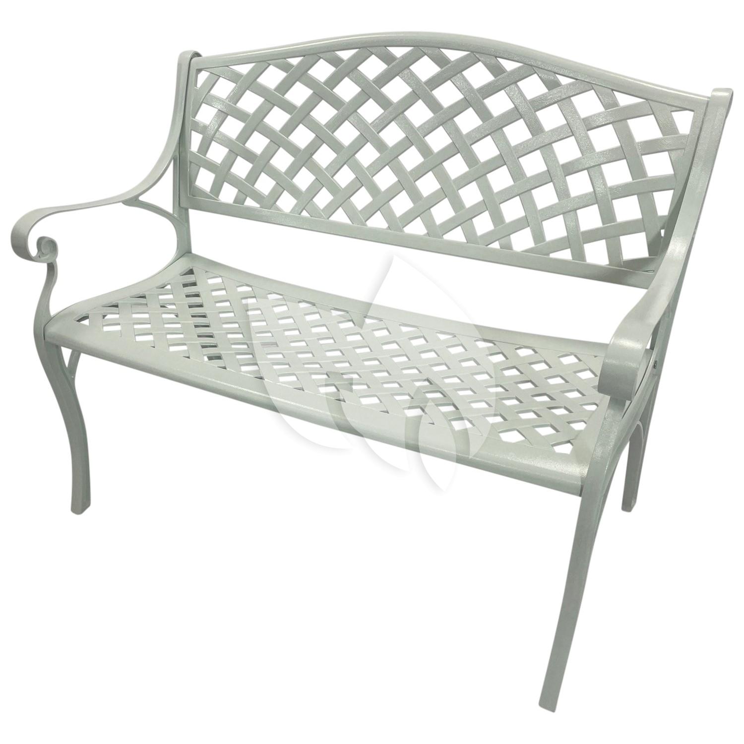 Een strakke tweezits tuinbank van gegoten aluminium in een heldere witte kleur. Ideaal voor een moderne en comfortabele zitplek in de tuin.
