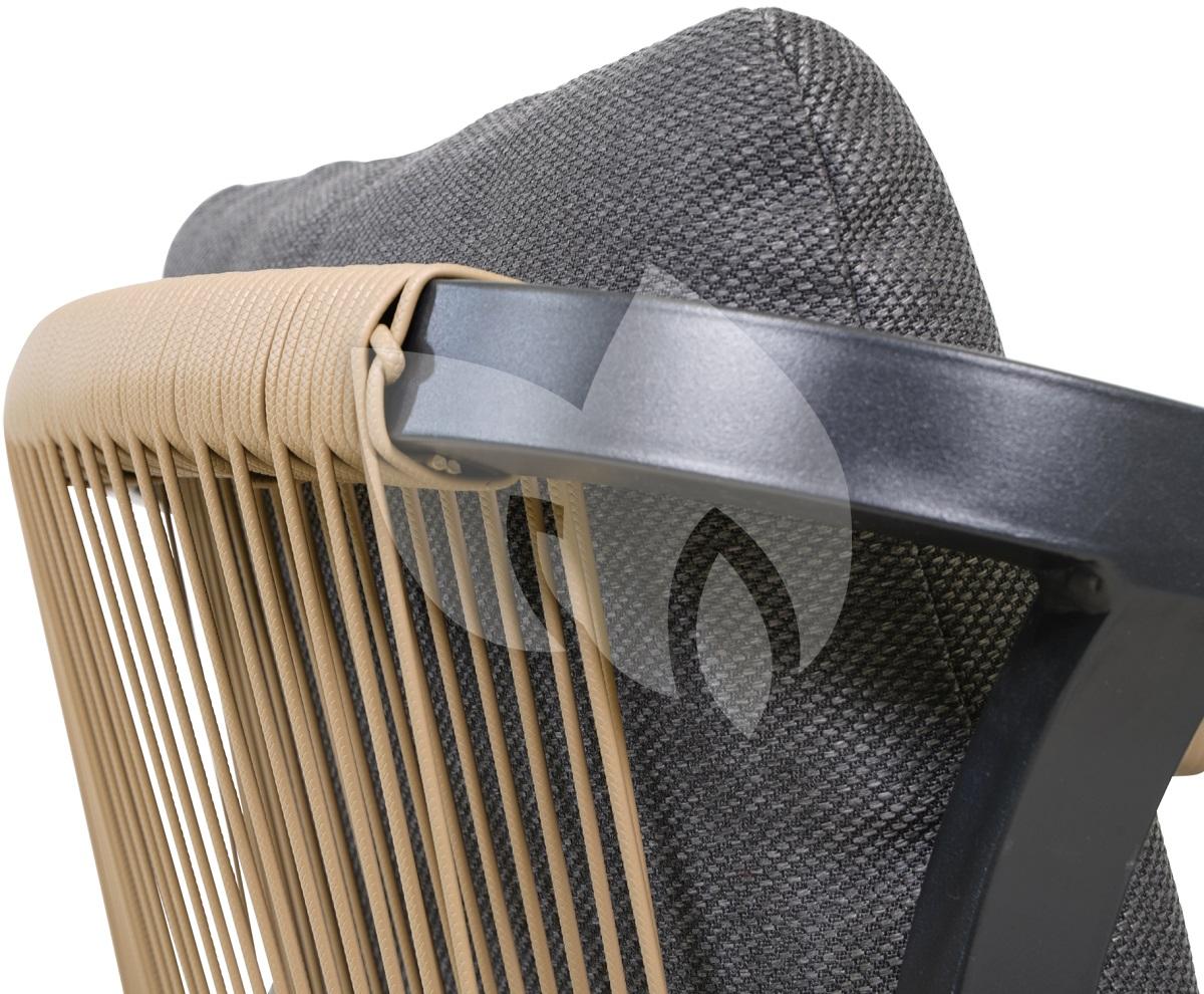 De robuuste tuinstoel Rimini heeft een lichtgewicht aluminium frame. De rugleuning is afgewerkt met wicker touw en de brede armleuningen zijn daar ook mee bekleed. De rugleuning is rond en van een gemiddelde hoogte. De stoel is stapelbaar en wordt geleverd inclusief een comfortabel zitkussen en rugkussen.