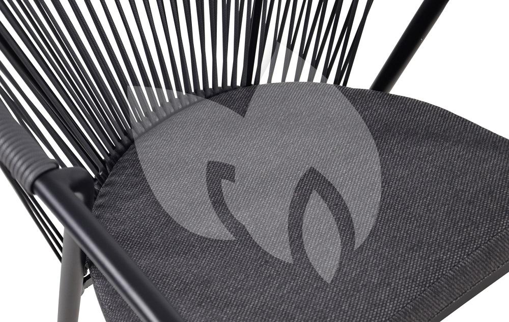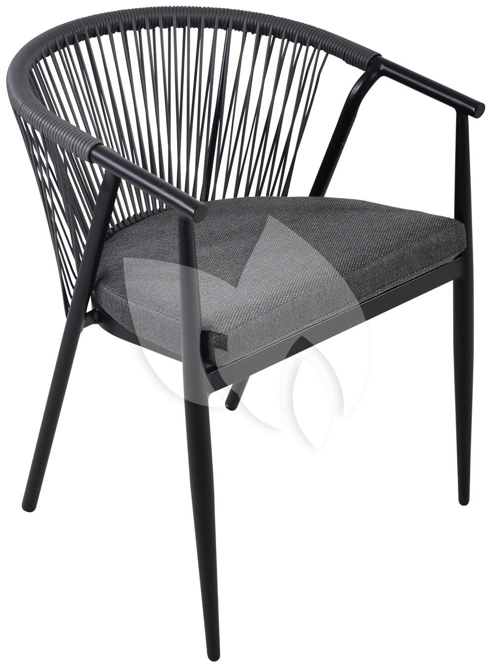 De stapelbare tuinstoel Silvan heeft een lichtgewicht mat zwart aluminium frame. De ronde rugleuning is uitgevoerd in grijs wicker touw. De stapelstoel wordt geleverd met een stevig zitkussen dat is bekleed met outdoor stof.