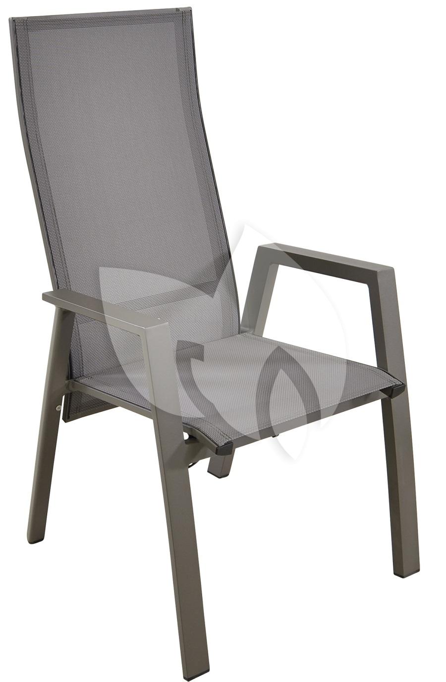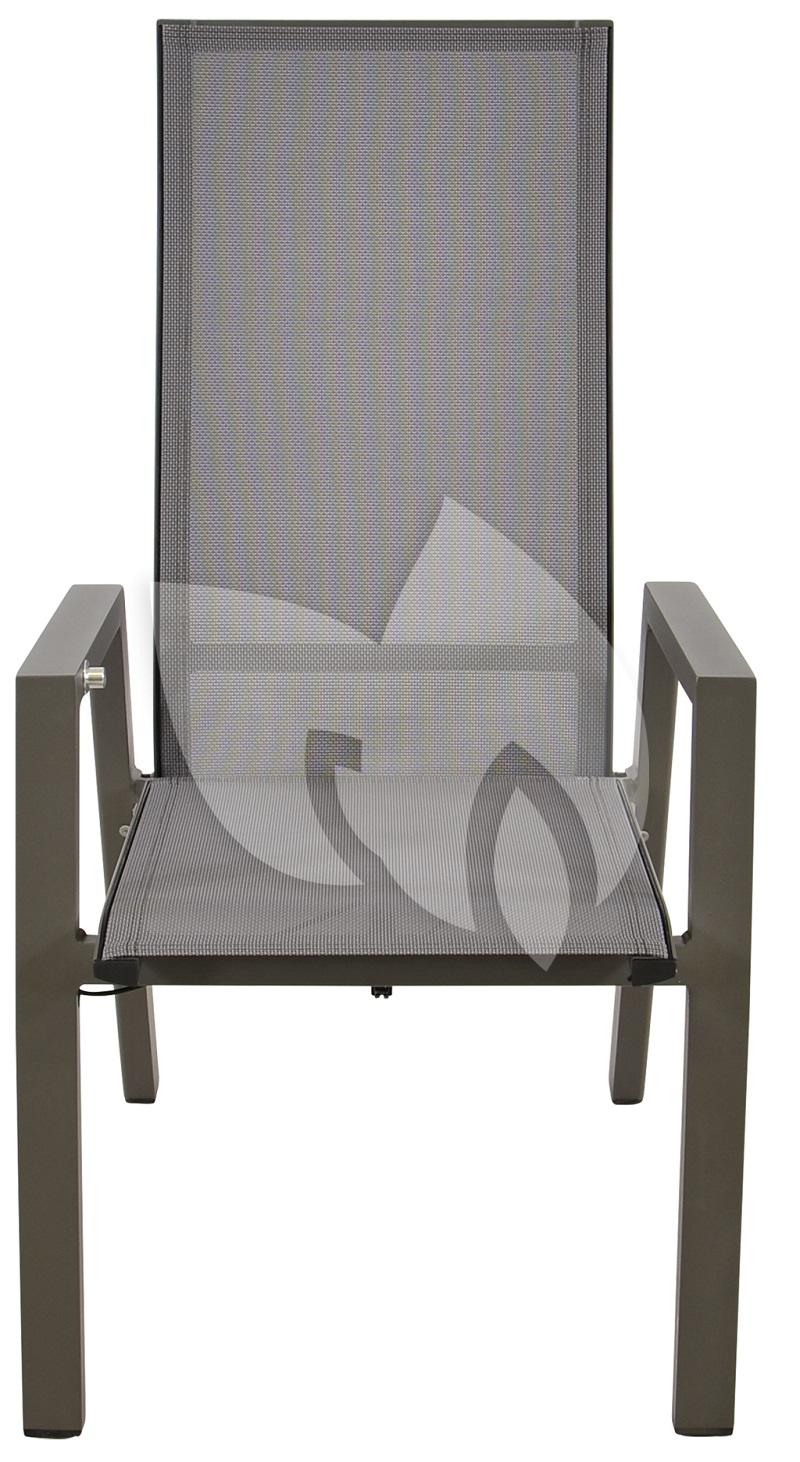 Deze tuinstoel met hoge- en verstelbare rugleuning heeft een robuust uiterlijk door de vormgeving van het aluminium frame met matte finish. Door de materiaalkeuze van aluminium met een zitting en rugleuning van textileen is deze standenstoel licht van gewicht en makkelijk te verplaatsen. De strakke afwerking en rechte zit zorgen voor een ideale tuinstoel, ook voor het gebruik aan een tuintafel.