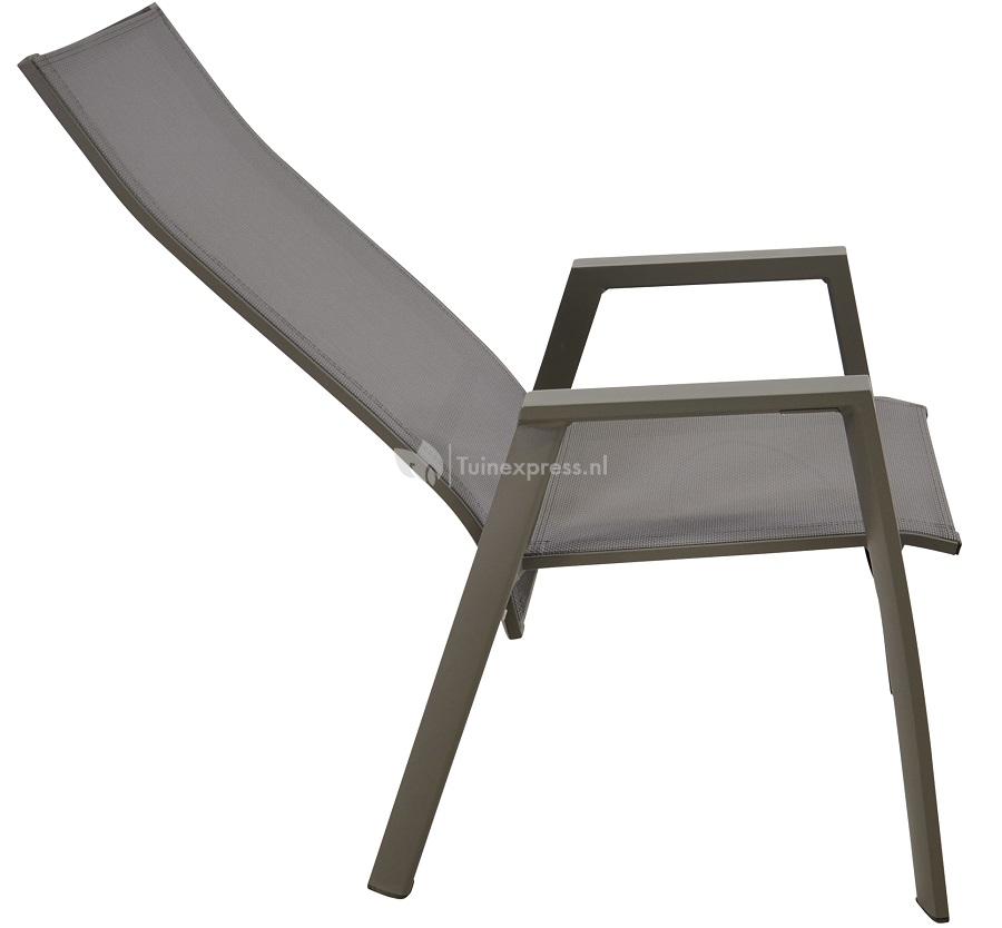 Verstelbare tuinstoel Amir is licht van gewicht door het frame van aluminium en het gebruik van textileen stof voor de rugleuning en de zitting. Deze standenstoel heeft een vrij rechte zit en een wat hogere rugleuning. De zitting en de rugleuning zijn op elkaar aangesloten en de armleuningen zijn breed.