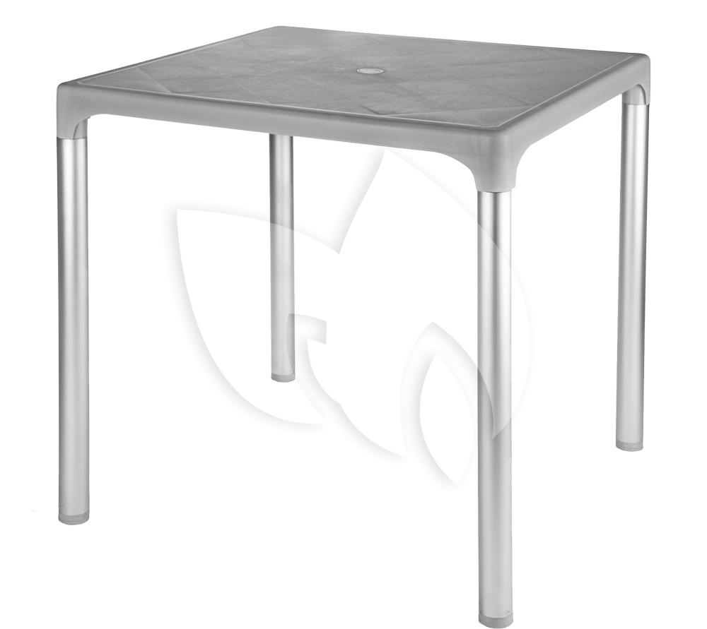 Breid uw terras uit met de tafel van Bella. Deze grijze tafel is gemaakt van kunststof en staat op aluminium poten. In het midden van de tafel bevind zich een gat waar een parasol in geplaatst kan worden. Deze tafel staat strak op uw terras en laten het kleurrijk ogen.