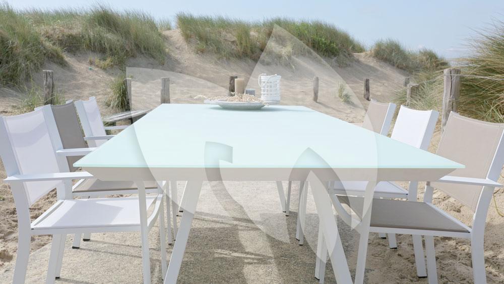 Deze prachtige tuintafel Breeze is een aanwinst voor ieder terras. De tafel heeft een wit aluminium frame en een mat glas tafelblad. Dit glazen tafelbad geeft de tuintafel een luxe en stijlvolle uitstraling en maakt hem zeer geschikt om aan te eten of dergelijke. De tuintafel is perfect te combineren met de tuinstoelen Breeze, zo creëert u een complete, stijlvolle tuinset.