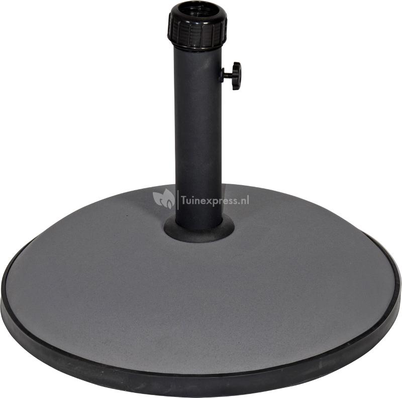 Zet de parasol stevig neer op uw terras en geniet onbezorgd van een warme zomerdag. De parasolvoet beton rond is geschikt voor parasols met een diameter tussen de 28 en 48 millimeter en zorgt ervoor dat uw parasol altijd stabiel staat. Het gewicht van de parasolvoet is erg belangrijk bij de stabiliteit van de parasol. Wat het minimale gewicht van uw parasolvoet dient te zijn is eenvoudig te bereken. Deel de diameter van de uitgeklapte parasol (in centimeters) door 10, dit is het aantal kg dat de parasolvoet minimaal dient te zijn. Een parasol met een diameter van 300 centimeter heeft dus een parasolvoet van minimaal 30 kg nodig.
