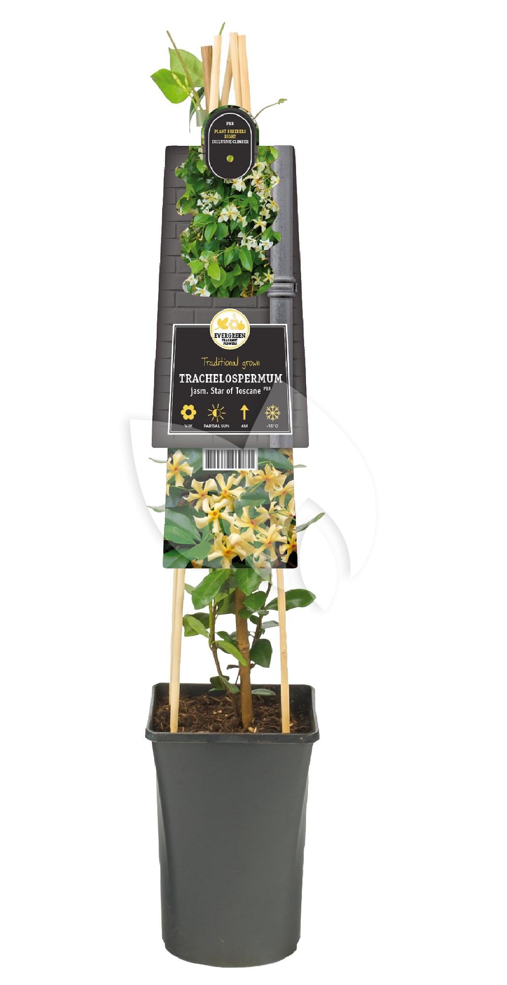 De Toscaanse Jasmijn Trachelospermum Jasminoides Star of Toscane is een prachtige klimplant met donkergroene bladeren en stervormige bloemen. De bloeiperiode van de plant is van mei tot en met september en de hoofdbloei valt in juni en juli. Geef deze klimplant een mooi plekje in de zon of halfschaduw en geniet van deze sfeervolle plant.