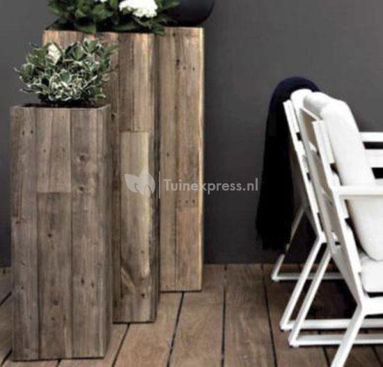 De plantenbak is vervaardigd uit gerecycled hout en hierdoor is ieder exemplaar uniek.