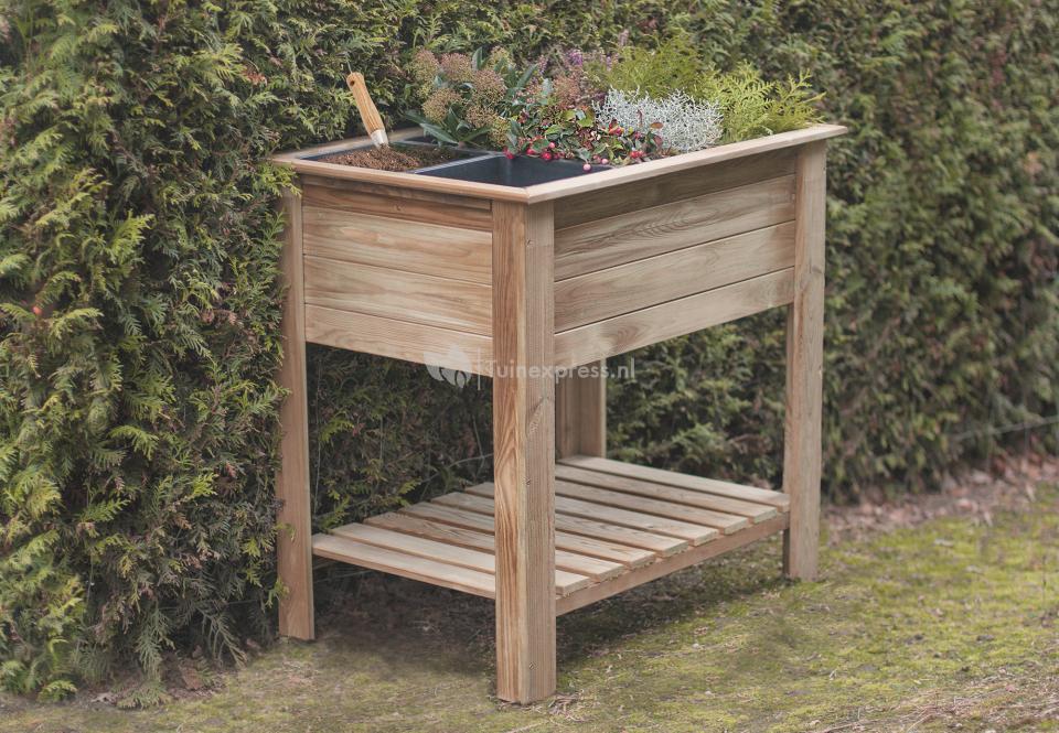Moestuintafel van geimpregneerd grenen. Voorzien van 6 plastic inzetbakken.