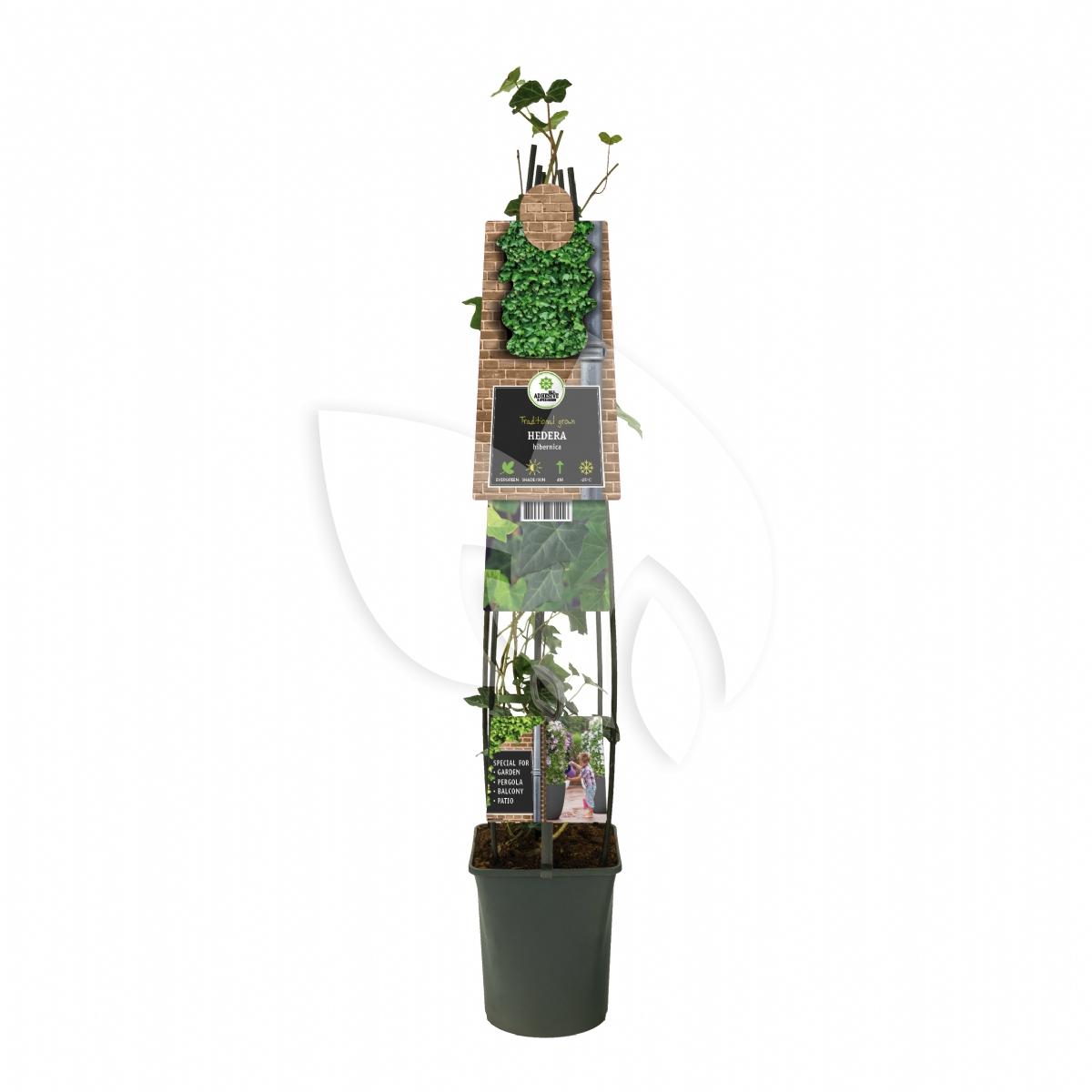 Een zeer populaire klimop soort is de Ierse klimop. Het is een van de meest verkochte klimplanten. Het is een zeer sterke klimmer die een hoogte van 10m kan bereiken. De plant oogt wat grof met zijn grote blad. Deze klimop is een zeer snelle klimmer en daarmee zeer geschikt voor een dichte begroeiing op schuttingen en gaaswanden. Met kleine wortels zet hij zich vast aan hekken en muren. Deze klimop soort is tevens te gebruiken als bodembedekker. Ierse klimop is winterhard en brengt dus tevens in de winter kleur in uw tuin. Klimop is geen veeleisende plant, op iedere standplaats vind hij zijn weg. Ierse klimop bloeit met kleine trosjes gele bloemetjes, die als een stervormig figuur bij elkaar staan. De kleine bloemetjes hebben niet veel sierwaarde, de manier van groeien wel. Na de bloei ontstaan kleine besjes. De bloei is in het najaar tot winter en is dan ook uitermate geschikt voor verwerken in bloemstukjes. Voor vogels zijn deze besjes een groot feest, voor ons zijn ze giftig. Wilt u snel een dichte groene haag zien, de Ierse klimop zal u niet teleurstellen!