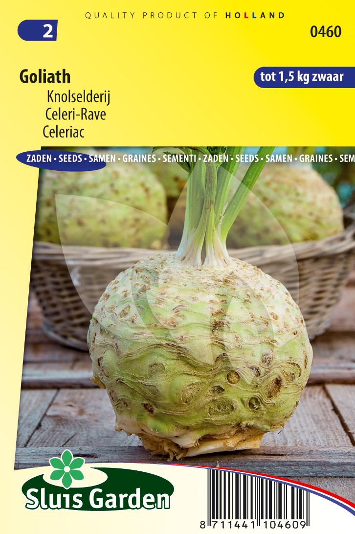 De Knolselderij is een variant van de selderijplant en vormt net boven de grond een knol. De knol is bruingeel van kleur en heeft licht vruchtvlees met een milde, kruidige smaak. Deze Goliath is een verbeterde versie van de oude Prager Reuzen. De Goliath is beter resistent, beter bestand tegen ''schieten'' en gemakkelijker schoon te maken. Bij voorkeur kunt u vanaf maart beginnen met het voorzaaien onder glas. Na opkomst de plantjes verspenen, even laten afharden en in mei kunt u ze buiten uitplanten op een vochthoudende grond. U kunt er ook voor kiezen om vanaf mei buiten te zaaien, te verspenen en uitplanten. De oogstijd is van september tot en met november waarbij u erop moet letten dat u de knolselderij oogst voordat de vorst invalt. De geoogste knollen kunt u op een koele plek lang bewaren.