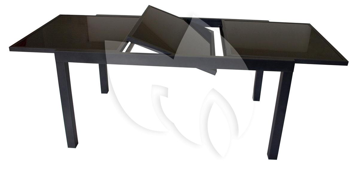 Uitschuiftafel van aluminium/glas: Dit is een hoogwaardige uitschuiftafel die bestaat uit een onderstel van gepoedercoat aluminium en een tafelblad van veiligheidsglas. Het onderstel is mat-antraciet van kleur en het tafelblad is zwart.