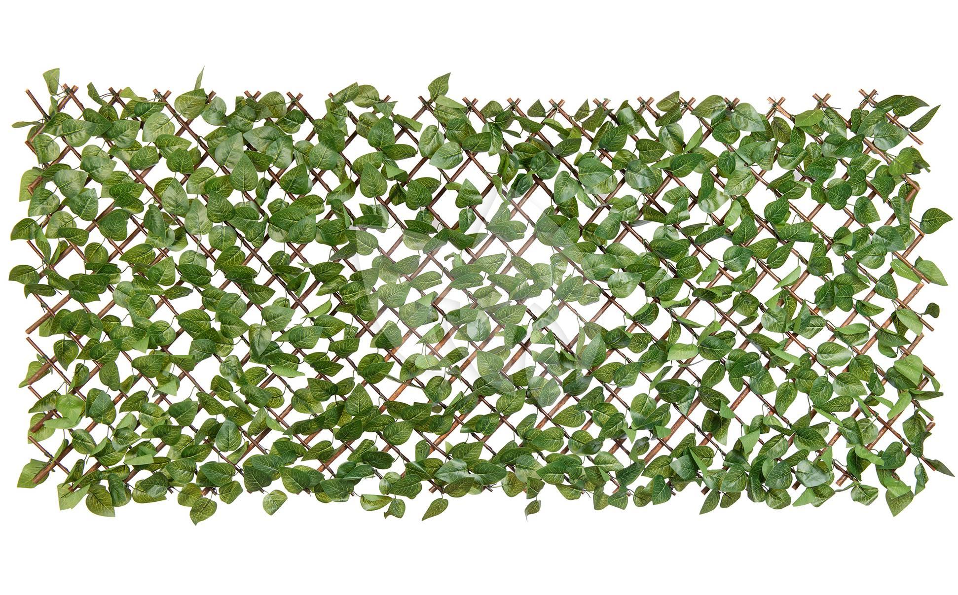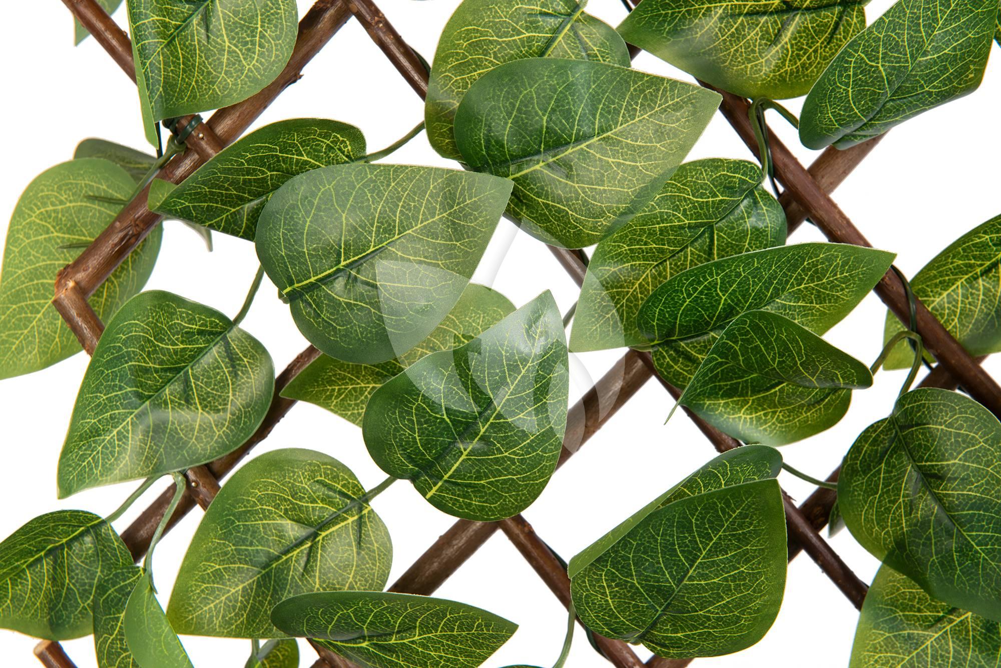 Verstelbare wilgen klimrekken met kunststof laurierblaadjes, uitrekbaar tot een maximale breedte van 180 cm. Kwalitatief en weerbestendig wilgenhout geschikt als greenwall voor binnen of als afscheiding buiten. Aanbevolen bij gebruik voor buiten het rek onder een overkapping te plaatsen in verband met het behoud van het kunststof blad.