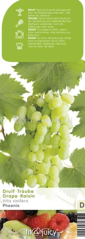 De Phoenix geeft mooie volle trossen witte druiven. De vruchten zijn geschikt om vers te eten, maar tevens zeer geschikt voor het maken van een heerlijke wijn. De Phoenix heeft een dunne schil, heerlijk om te eten, maar daardoor wel wat gevoeliger voor beschadigingen. Een druivenplant in de tuin is niet enkel heerlijk, maar ook zeer decoratief!