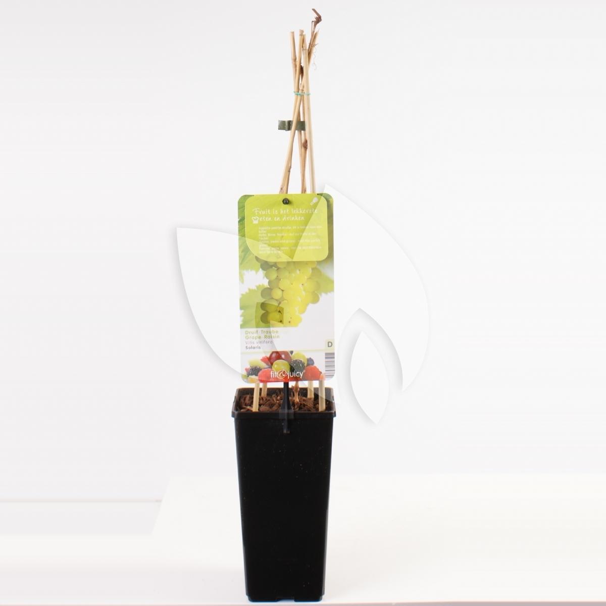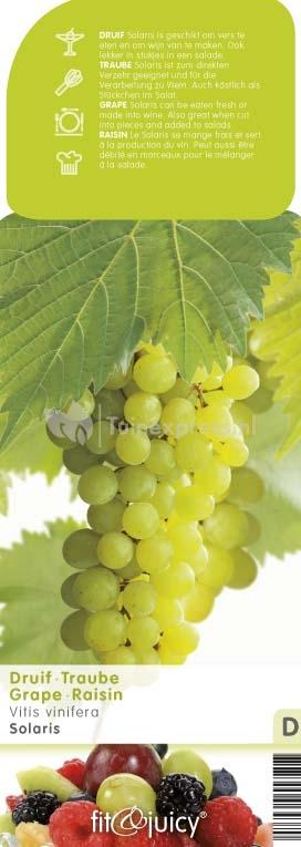 De Solaris is een relatief nieuwe witte druifsoort. De plant is zeer geschikt in wat koudere klimaten en doet het dus ook zeer goed in Nederland. Het is een druif die veel gebruikt wordt voor het maken van wijnen, maar ook tevens zeer geschikt is om vers te eten. De grote trossen druiven zijn plukrijp vanaf juli/augustus.