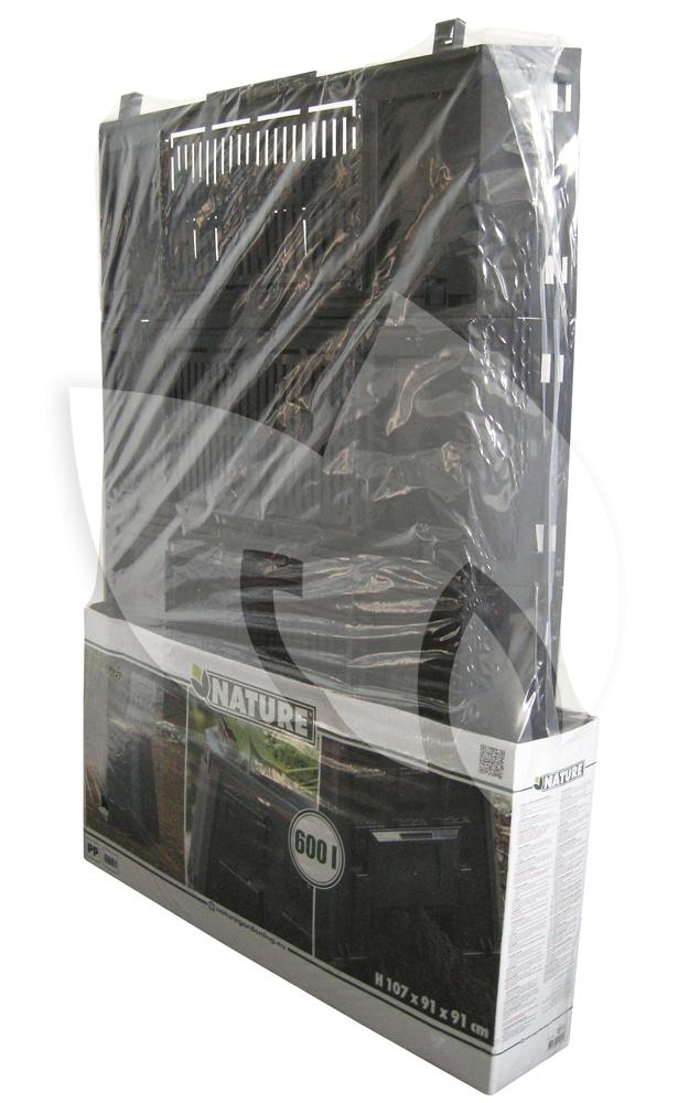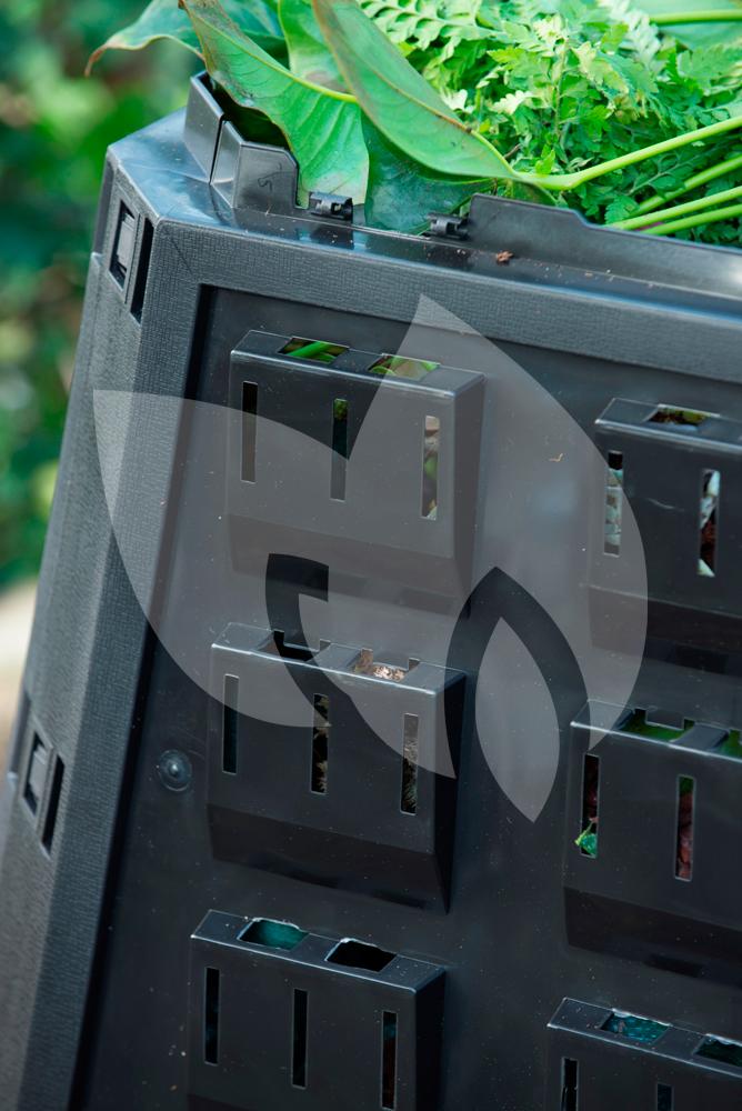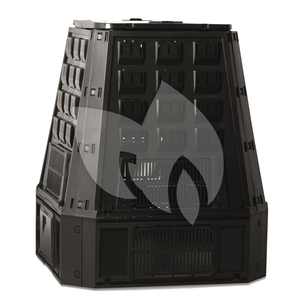 De compostbak is vervaardigd uit bestendig polypropyleen en heeft een inhoud van 600 liter. De zwarte compostbak is voorzien van een scharnierend deksel om het afval in te werpen en een opening aan de voorzijde om de compost te kunnen omwoelen of verwijderen. In de wanden van de silo zijn Thermolen verwerkt die voor een constante hoge temperatuur zorgen waardoor het afval sneller wordt afgebroken. De compostbak beschikt over een inklapbaar systeem waardoor hij makkelijk in elkaar te zetten is en waarnodig eenvoudig opgebergd kan worden. Om micro-organismen aan te trekken kunt u het compostvat het beste op de grond in de schaduw neerzetten. Leg op de bodem enkele takken neer, dit zal zorgen voor een goede afwatering en verluchting.
