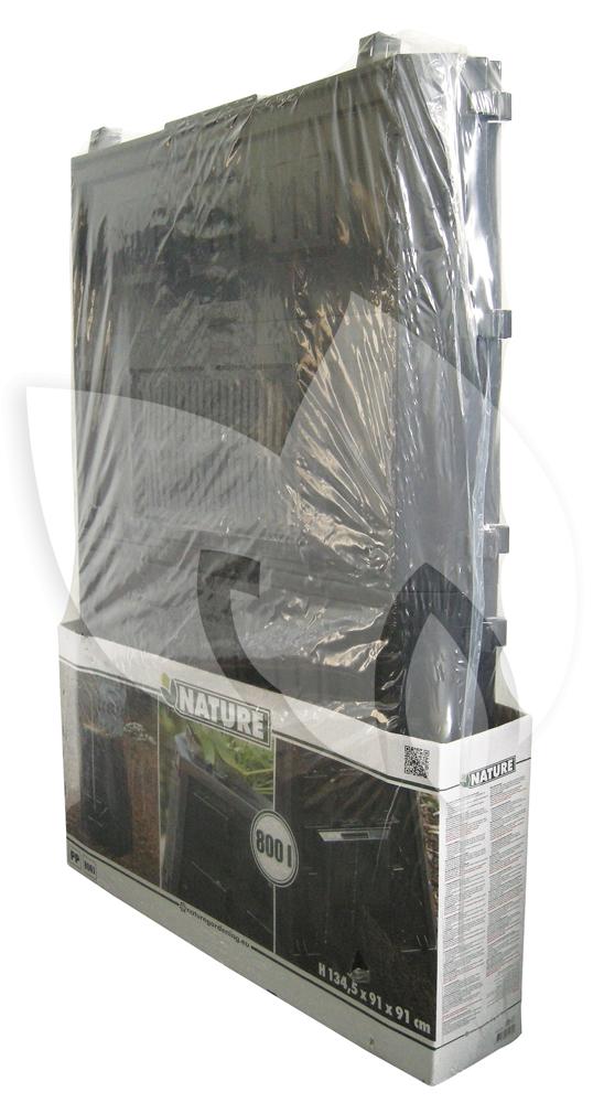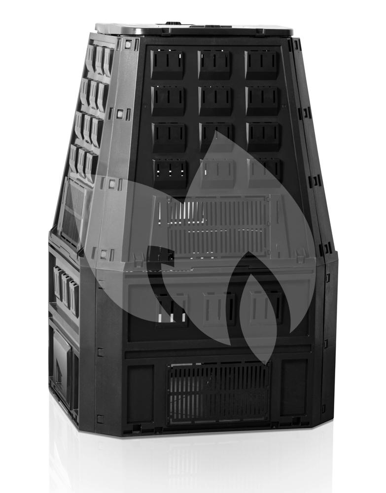 De compostbak is vervaardigd uit bestendig polypropyleen in de kleur zwart en heeft een ruime inhoud van 800 liter. De compostbak is voorzien van een scharnierend deksel om het afval in te werpen en een opening aan de voorzijde om de compost te kunnen omwoelen of verwijderen. In de wanden van de silo zijn Thermolen verwerkt die voor een constante hoge temperatuur zorgen, waardoor het afval sneller wordt afgebroken. De compostbak beschikt over een inklapbaar systeem waardoor hij makkelijk in elkaar te zetten is en waarnodig eenvoudig opgebergd kan worden. Om micro-organismen aan te trekken kunt u het compostvat het beste op de grond in de schaduw neerzetten. Leg op de bodem enkele takken neer, dit zal zorgen voor een goede afwatering en verluchting.