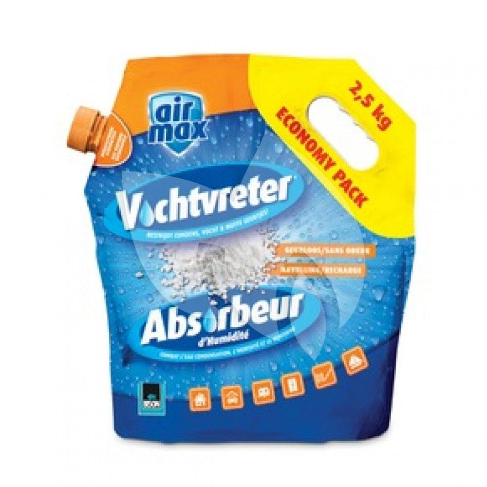 De Air Max vochtvreter navulling 2,5 kg is een navulling voor de Air Max vochtvreters. De zak heeft een inhoud van 2,5 kg en is hersluitbaar middels de schenktuit. De samengeperste actieve hygroscopische kristallen in een vochtvreter halen overtollig vocht uit de lucht waardoor de luchtvochtigheid in balans blijft. Zo voorkomt u condens, vocht en muffe geuren. Een vochtvreter is een handig hulpmiddel in afgesloten ruimtes waar weinig tot geen ventilatie is, bijvoorbeeld in een caravan, boot, schuur, meterkast, voorraadkast, zolder, kruipruimte, kelder, kledingkast, logeerkamer, keukenkast en dergelijke.
