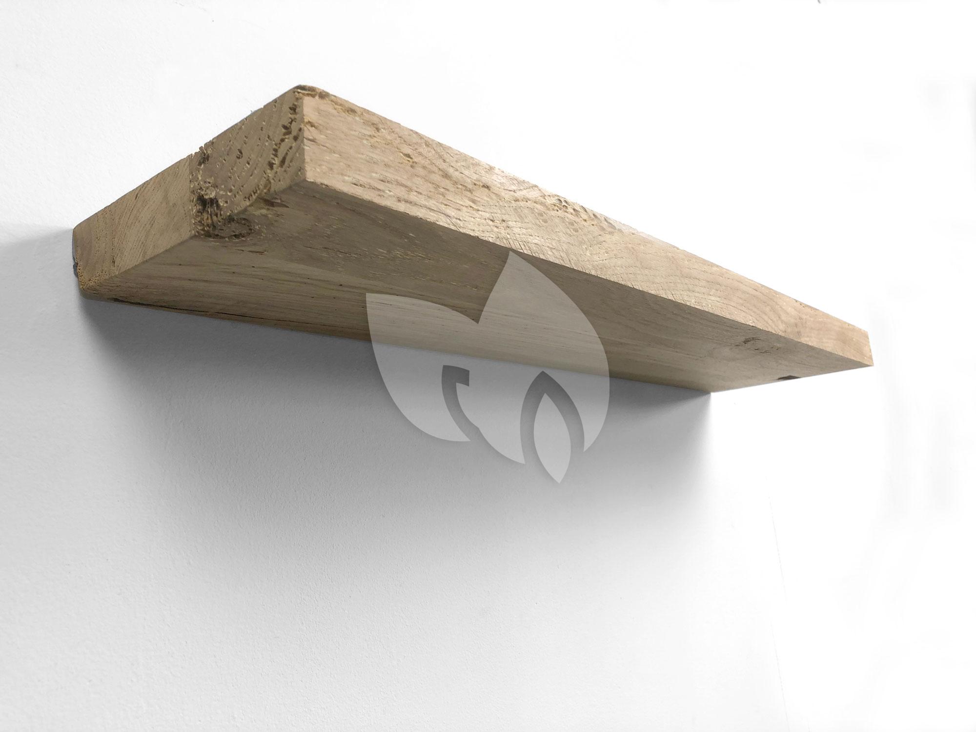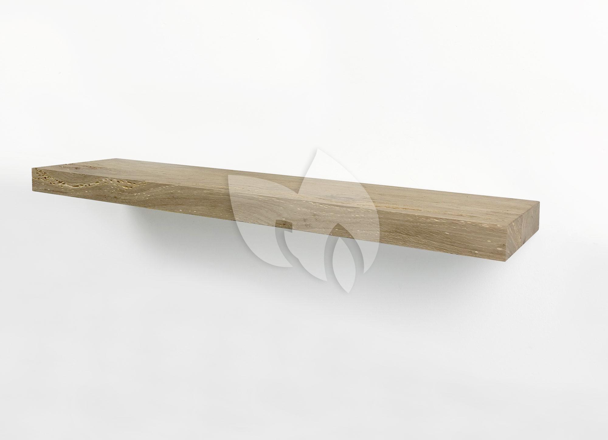 Zwevende wandplank van oud eikenhout met recht gezaagde afwerking aan het vooraanzicht.