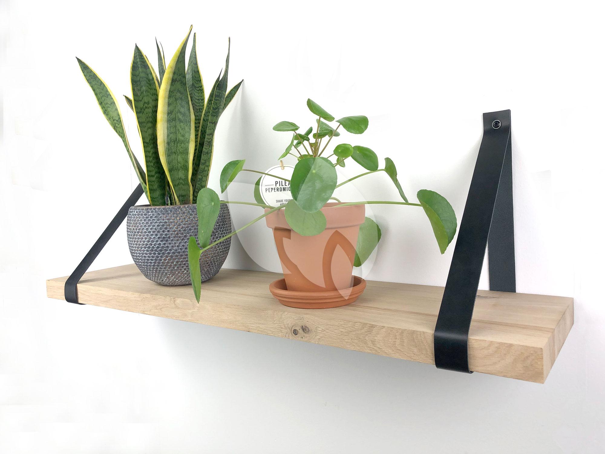 Eiken wandplank massief recht 80 x 25 cm inclusief leren riemen zwart