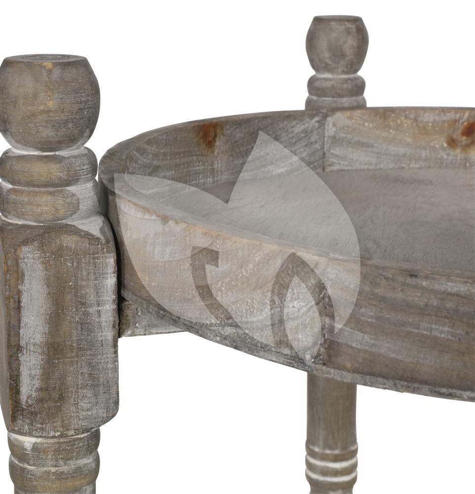 Dit sfeervolle ronde bijzettafeltje heeft een bijzondere look. Met behulp van het bijzettafeltje verandert u een saaie hoek in een mum van tijd in een interessante hoek met verschillende groene planten of andere decoratie artikelen. Het donkere hout is afgewerkt met een whitewash wat het tafeltje doet leven. Heeft u klassiekere meubelen, dan past dit bijzettafeltje hier zeker tussen.