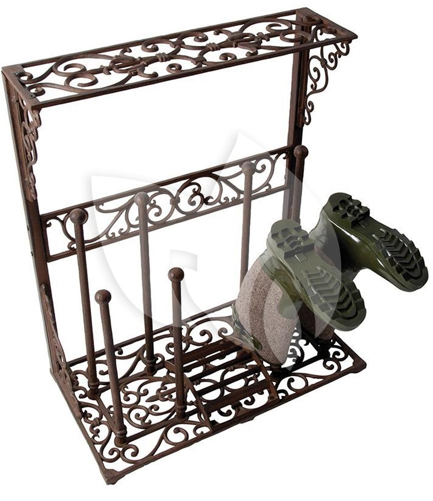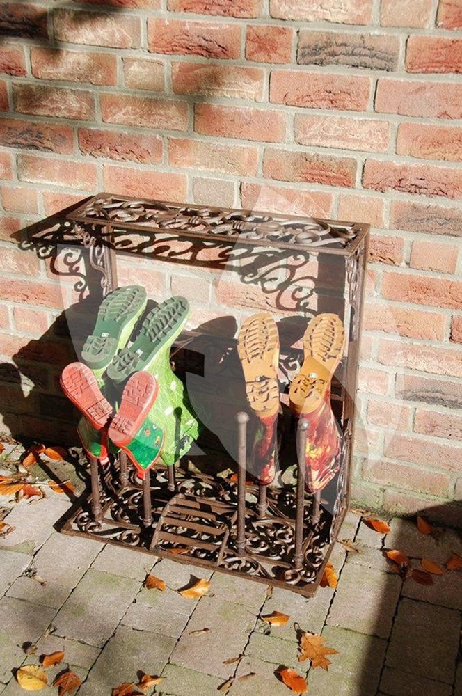 Het laarzenrek is gemaakt van gietijzer en is daardoor zeer stevig en weersbestendig, door dit materiaal bent u verzekerd van jarenlang gebruiksplezier. De mooie Victoriaanse krullen in het laarzenrek maken het rek een decoratief element in uw tuin. Het laarzenrek heeft een hoogte van 77 centimeter en biedt plaats aan vier paar laarzen. Het laarzenrek wordt geleverd als bouwpakket maar is eenvoudig in elkaar te zetten.