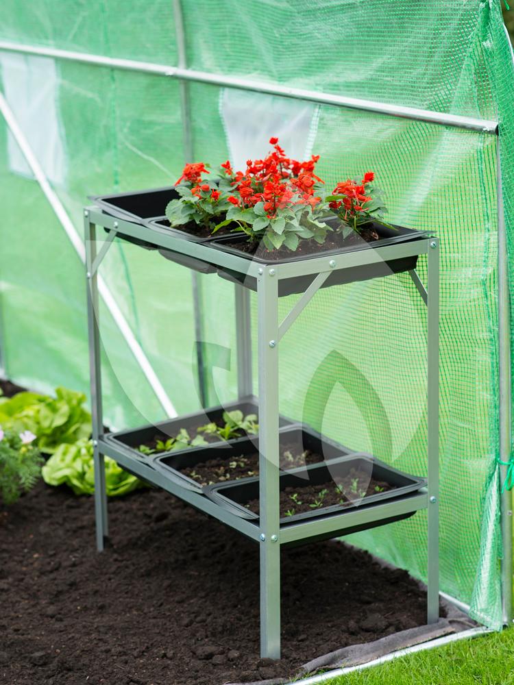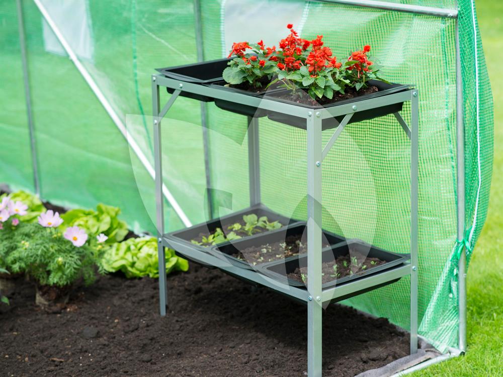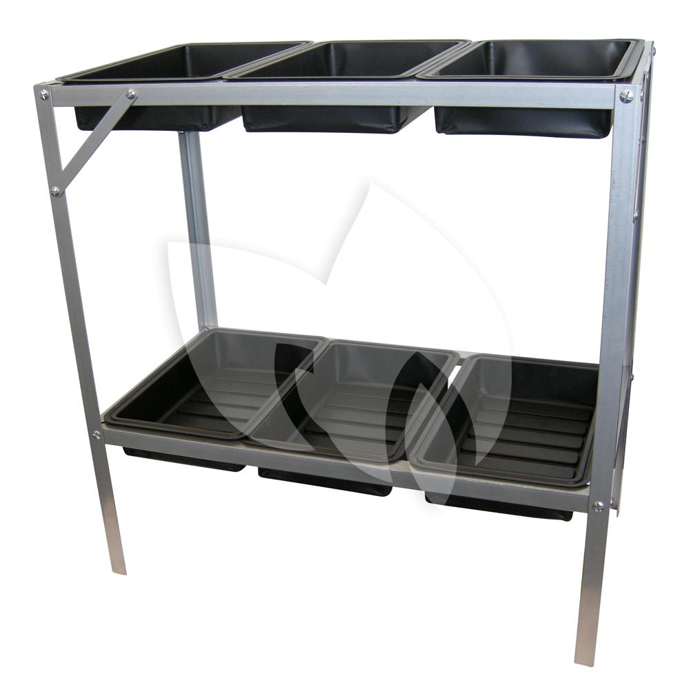 De oppottafel is gemaakt van verzinkt staal en voorzien van twee etages met drie zaaikistjes per etage. Dankzij zijn opvouwbaarheid kunt u de tafel eenvoudig verplaatsen en opbergen. De oppottafel wordt geleverd inclusief 6 zaaibakken.